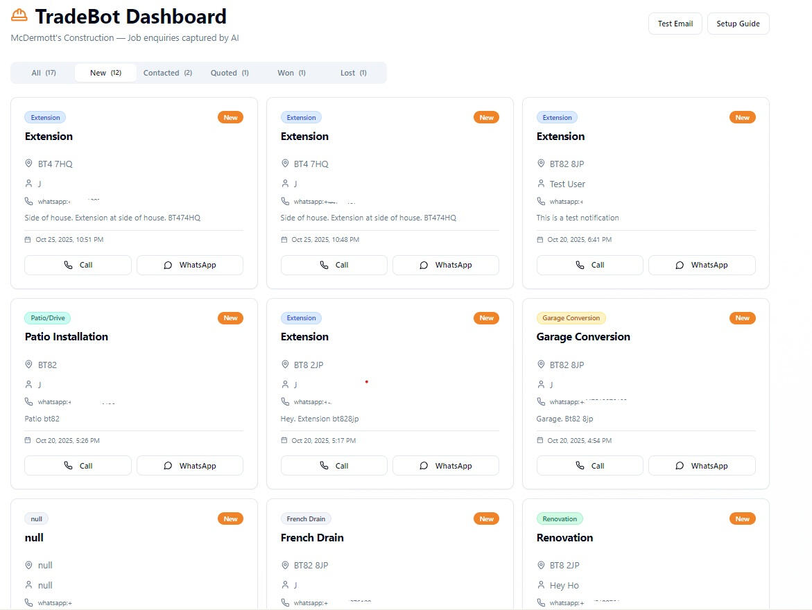 Every enquiry is automatically saved in your TradeBot dashboard — organised by job type, status, and customer details.You can filter jobs, track progress, and contact clients directly by phone or WhatsApp — all from one screen.