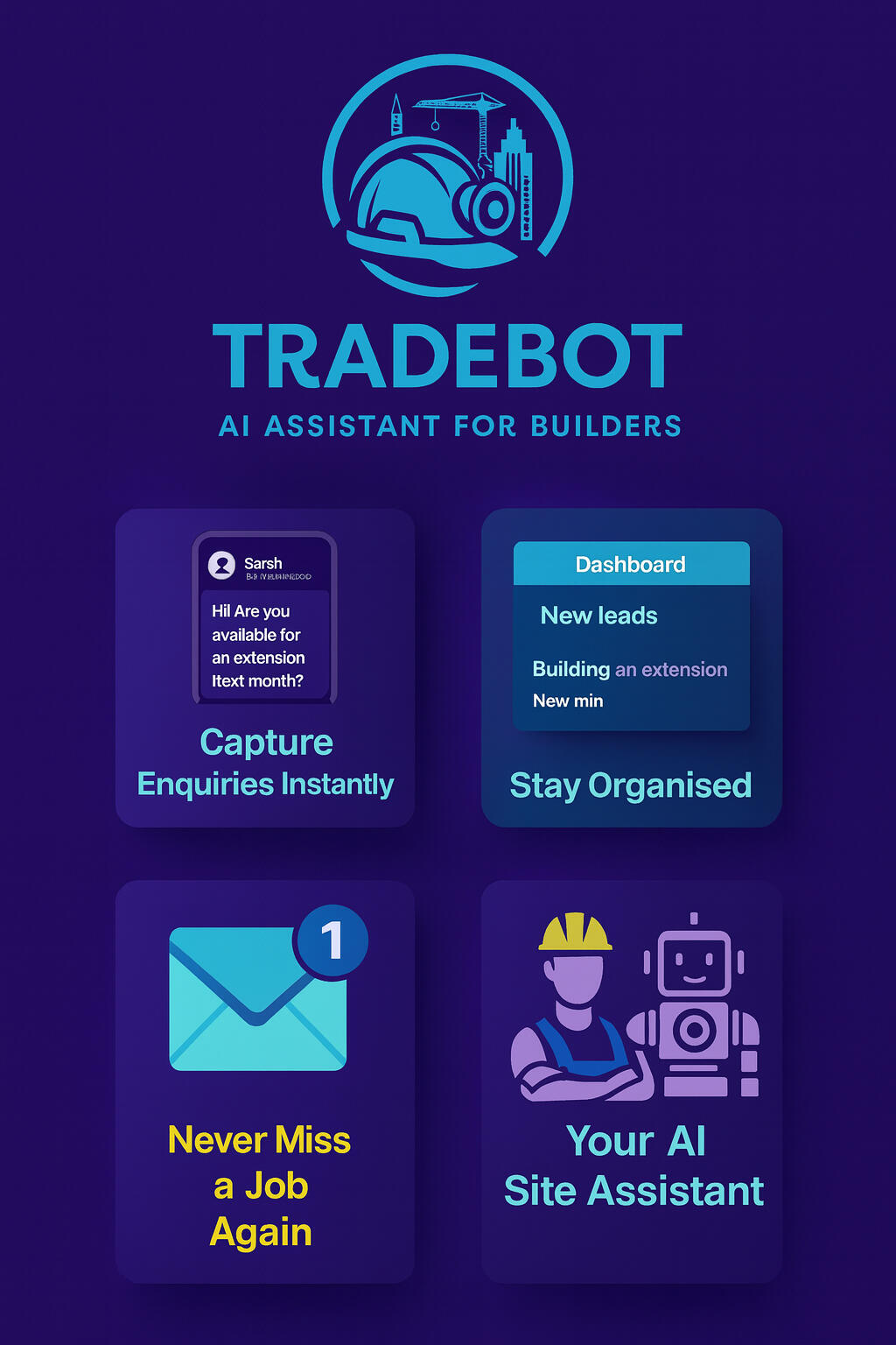 TradeBot is your AI WhatsApp assistant that captures building job enquiries while you’re on-site.🧱 Never miss another lead